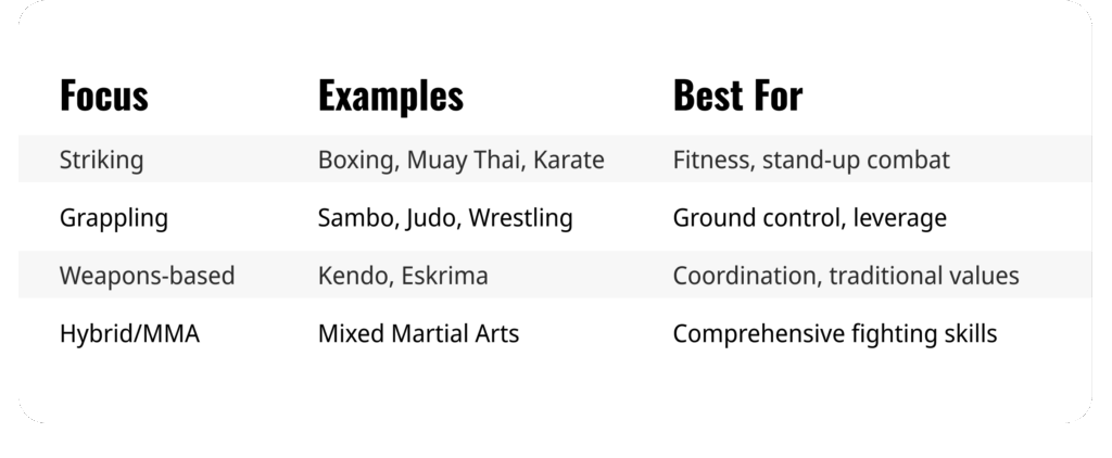 Each style offers different benefits. Striking arts typically burn more calories, while grappling can build functional strength. Traditional martial arts often include philosophical elements that promote mental discipline.